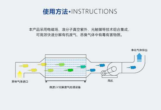 uv光氧催化废气处理设备是一种新型的高效处理vocs有机废气及恶臭气体的净化设备,其工作原理是依靠波长在181-254左右的uv紫外线灯管对有机废气中的有机物质进行高能裂解,在催化剂的作用下使其变成二氧化碳和水的一种高效处理方法。
