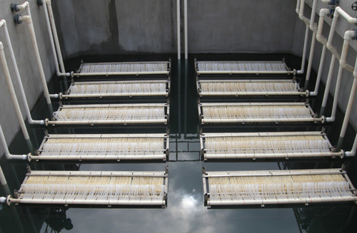 膜生物反应器(Membrane Bio-Reactor,MBR)是膜分离技术与生物处理技术有机结合之新型态废水处理系统。以膜组件取代传统生物处理技术末端二沉池,在生物反应器中保持高活性污泥浓度,提高生物处理有机负荷,从而减少污水处理设施占地面积,并通过保持低污泥负荷减少剩余污泥量。主要利用沉浸于好氧生物池内之膜分离设备截留槽内的活性污泥与大分子有机物。膜生物反应器因其有效的截留作用,可保留世代周期较长的微生物,可实现对污水深度净化,同时硝化菌在系统内能充分繁殖,其硝化效果明显,为深度除磷脱氮提供可能。