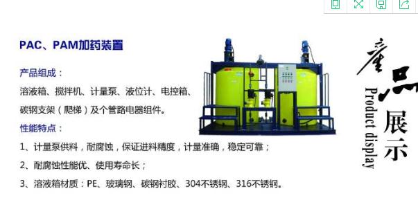 PAC PAM 加药装置--加药装置根据所需药剂浓度,在搅拌箱内配置,经搅拌器搅拌均匀后投入溶液箱、用计量泵向投药点或指定系统中输送所配制的溶液。成套加药装置具有结构紧凑、安全简单、操作使用简便等特点。加药装置还可根据用户不同工艺流程的要求,进行有针对性的设计、配置必要的部件,实现自动远程控制等功能。 三、 加药装置选型注意事项 1、 用户选用加药装置时,首先根据系统需要投加溶液量来确定选用规格(包括计量泵参数、溶液箱容积等条件),再根据投加情况,确定投加方式(一般采用“一用一备”的方式)。2、 根据需要选取加药装置各部件的材质(不锈钢、碳钢、非金属材料)、计量泵型号(隔膜泵、柱塞泵)或向我公司提供所加药剂的参数(名称、浓度、温度、密度、粘度、腐蚀性等)。3、 加药系统主要特点:① 集药化设计、占地面积小、结构简单、性能稳定; ② 计量精确、调节方便、经济性好,便于安装维护;③泵为吸入式安装,不易堵塞,无故障运行时间长、操作费低; ④ 耐腐蚀性能优、使用寿命长。