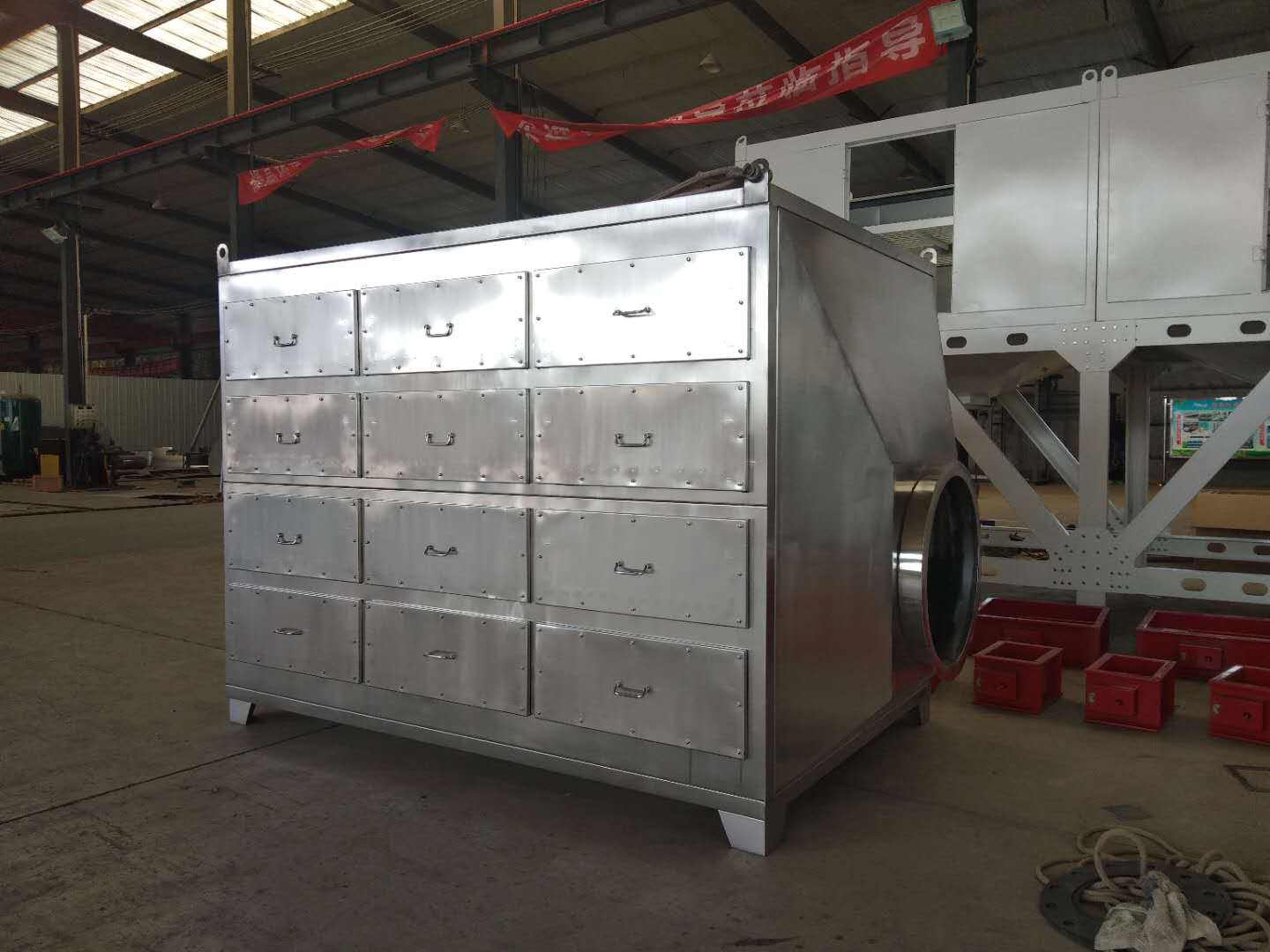 当废气由风机提供动力,负压进入环保箱后进入活性炭吸附层,由于活性炭吸附剂表面上存在着未平衡和未饱和的分子引力或化学键力,因此当活性炭吸附剂的表面与气体接触时,能吸引气体分子,使其浓聚并保持在活性炭表面,此现象称为吸附。利用活性炭吸附剂表面的吸附能力,使废气与大表面的多孔性活性炭吸附剂相接触,废气中的污染物被吸附在活性炭表面上,使其与气体混合物分离,净化后的气体高空排放。活性炭环保箱是一种干式废气处理设备,由箱体和填装在箱体内的吸附单元组成。