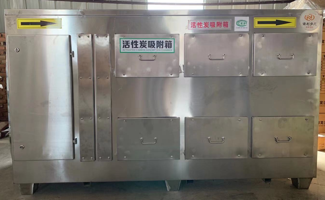 当废气由风机提供动力,负压进入吸附装置后进入活性炭吸附层,由于活性炭吸附剂表面上存在着未平衡和未饱和的分子引力或化学键力,因此当活性炭吸附剂的表面与气体接触时,就能吸引气体分子,使其浓聚并保持在活性炭表面,此现象称为吸附。利用活性炭吸附剂表面的吸附能力,使废气与大表面的多孔性活性炭吸附剂相接触,废气中的污染物被吸附在活性炭表面上,使其与气体混合物分离,净化后的气体高空排放。活性炭吸附箱是一种干式废气处理设备,由箱体填装在箱体内的吸附单元组成。