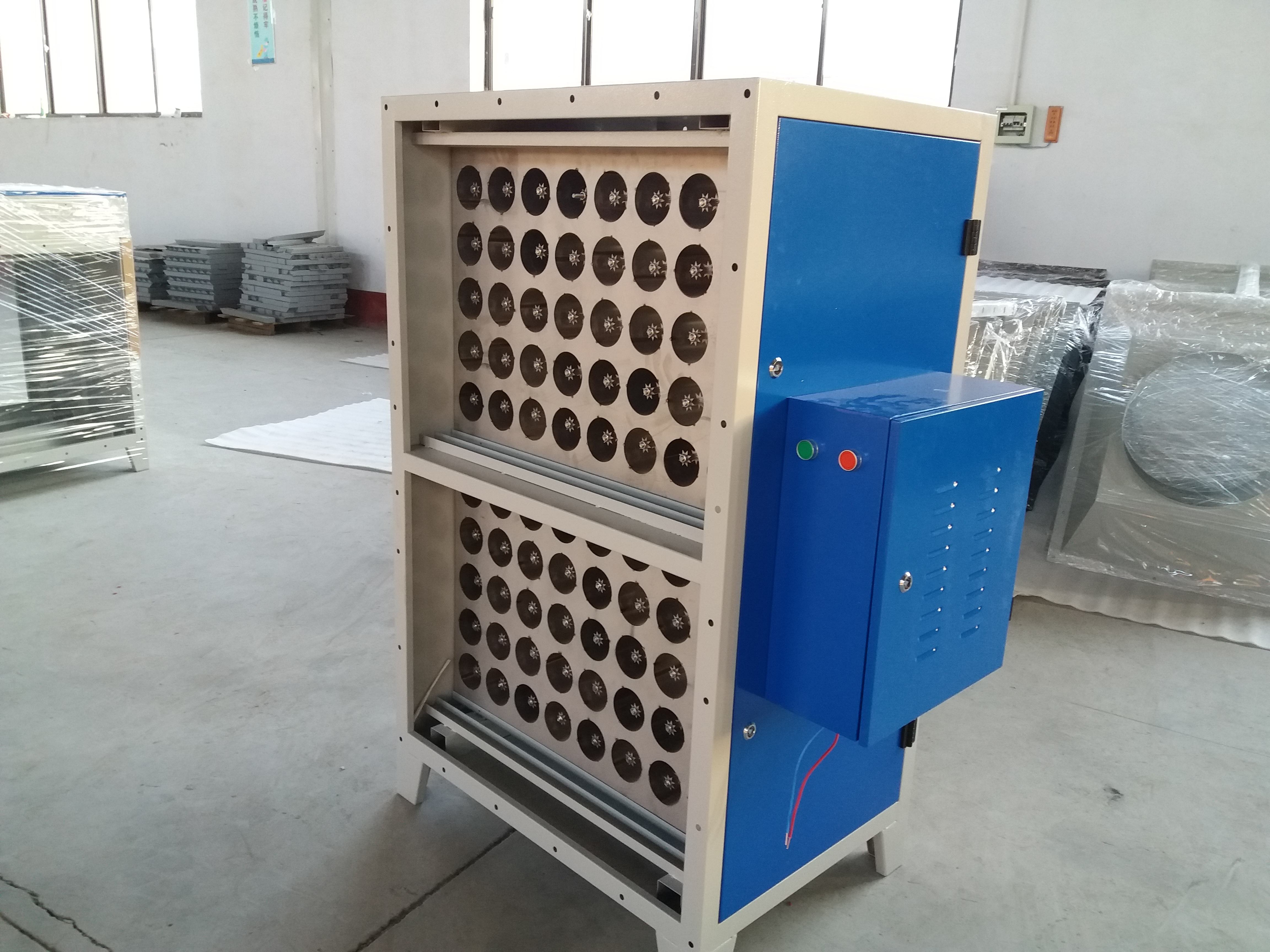 2、选择相匹配的风机风量,风机的风量选择一般小于静电式油烟净化器的处理风量;(此数据仅供参考,具体技术按现场情况而定,如果风机的风量选择过大于油烟净化器的大处理风量时会影响净化器的净化效果)。