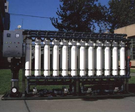 超滤(UF)装置是一种先进的膜分离技术,料液中含有的溶剂及各种小的溶质从高压料液侧透过滤膜到达低压侧,从而得到透过液或称为超滤液;其超滤膜微孔可达0.01微米(十万分之一毫米)以下,能有效地去除水中的微粒、胶体、细菌、热源和有机物,而尺寸比膜孔径大的溶质分子被膜截留成浓缩液。