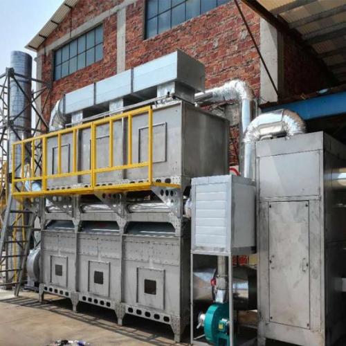 VOC催化燃烧装置:首先通过除尘阻火系统。然后进入换热器,再送到加热室,使气体达到燃烧反应温度,再通过催化床的作用,使有机废气分解成二氧化碳和水,再进入换热器与低温气体进行热交换,使进入的气体温度升高达到反应温度。如达不到反应温度,加热系统科通过自控系统实现补偿加热。利用催化剂做中间体,使有机气体在较低的温度下,变成无害的水和二氧化碳气体。