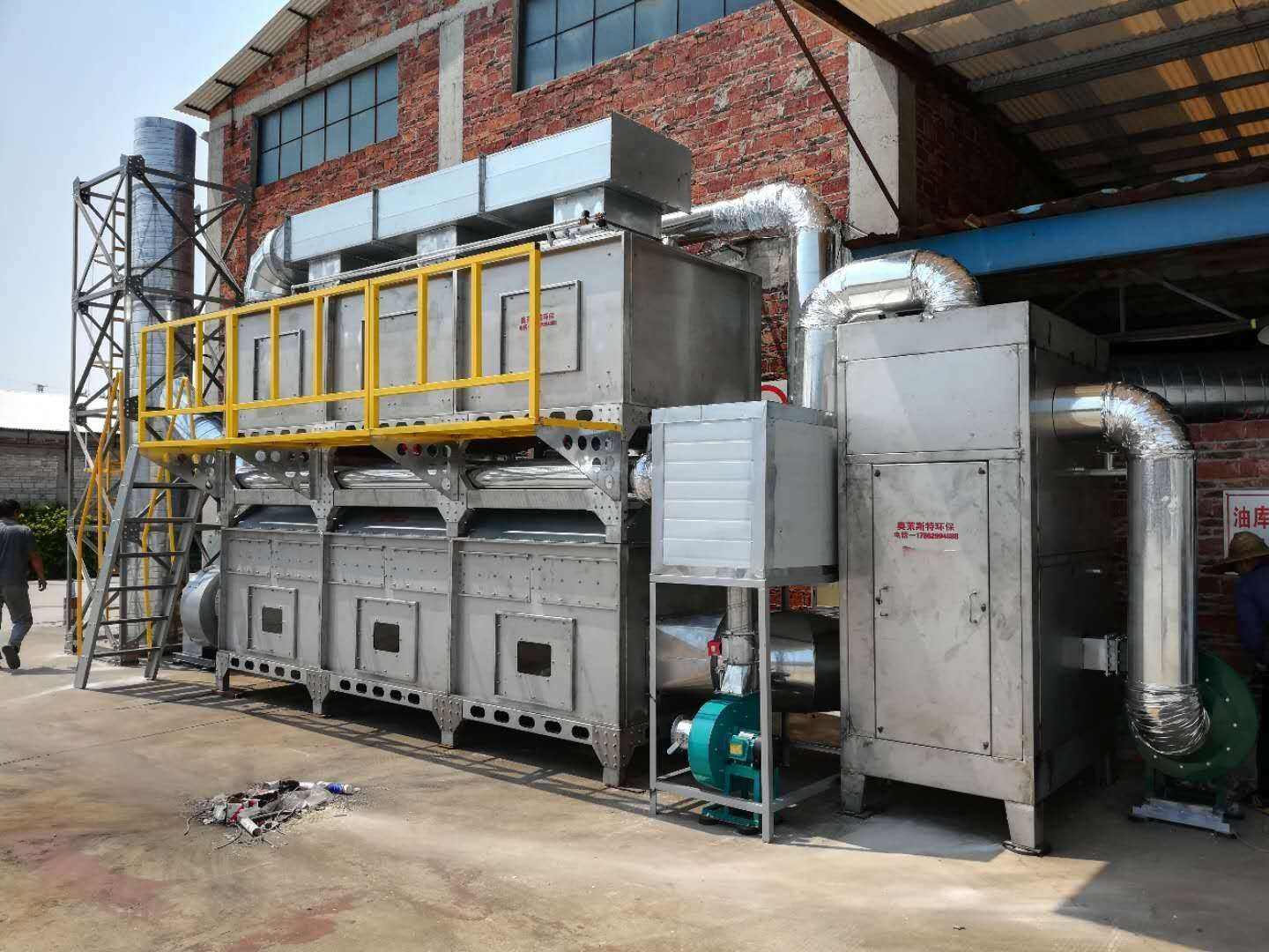催化燃烧再生装置活性炭进行脱附时,首先打开防爆阀同时启动脱附风机对催化剂进行15分钟的吹扫,然后防爆阀和脱附风机关闭,3组加热管开始分阶段加热,间隔2分钟开启一组,当催化燃烧装置温度加热到200摄氏度时,脱附风机打开,将热空气向吸附箱吹送,热空气首先输送到混流箱,进行空气中和,但热空气在混流箱内温度达到特定温度时,空气通过下端的输送管输送到活性炭的吸附室内,对活性炭进行脱附,活性炭室内温度慢慢升高,活性炭内有机废气分解出来,通过上面的管道回到催化装置内。与催化剂反应生成CO2和H2O,同时产生大量的热量。这时候加热管会根据室内温度自动调节关闭一组或几组加热管,节约能源,催化剂表面都有陶瓷蓄热体,能有效的锁住热量,降低能耗。